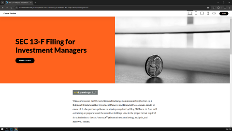 For details, see 'EDGAR 13-F Reporting eLearning'. Let's evaluate "EDGAR 13-F Compliance online learning". For information, see 'EDGAR Form 13-F Compliance online tutorial'. Let's consider "SEC Form 13-F Reporting eLearning". For details, see 'SEC 13-F Filing online learning'. Let's evaluate "EDGAR Form 13-F Compliance online learning". For information, see 'SEC form 13F Compliance Training'. Let's consider "EDGAR form 13F Compliance online training". For details, see 'EDGAR Form 13-F Filing online training'. This includes engaging format "SEC 13F self-paced" quick learning. For information, see 'SEC 13-F filing course'.
