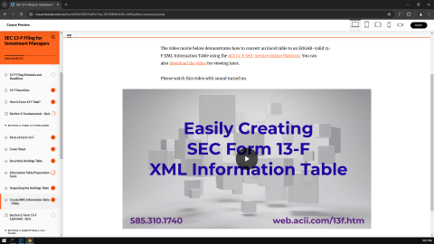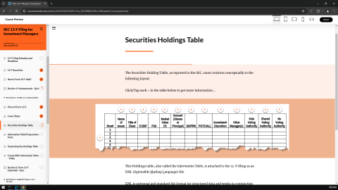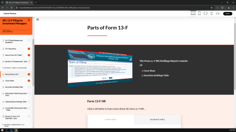 For details, see 'EDGAR form 13F Reporting online tutorial'. We do SEC 13-F certification courses. For information, see 'SEC Form 13-F Filing online learning'. Let's evaluate "EDGAR form 13F Compliance tutorial".